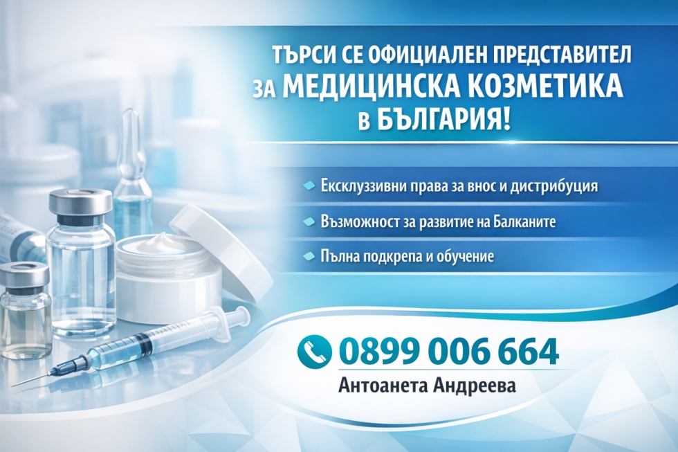 Нова възможност за стартиране на бизнес! Търси се официален представител за България на нова линия медицинска козметика, предназначена за професионална употреба. Продуктите са с изключително висок клас и се използват в клинична среда от естетични хирурзи, дерматолози, зъболекари и гинеколози.