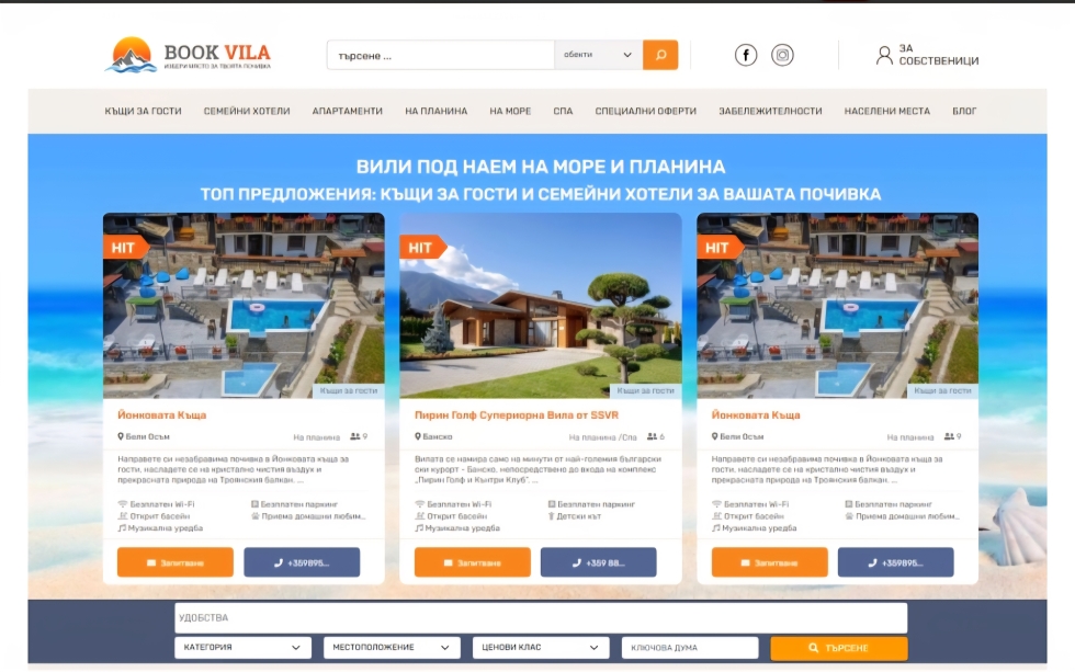 Поради ангажираност с други бизнес проекти и невъзможност да му се отдели нужното време, предлагам за продажба развиващ се и добре позициониран сайт – Bookvila.bg, специализиран в обяви за вили, къщи за гости, апартаменти и малки семейни хотели под наем в България.
