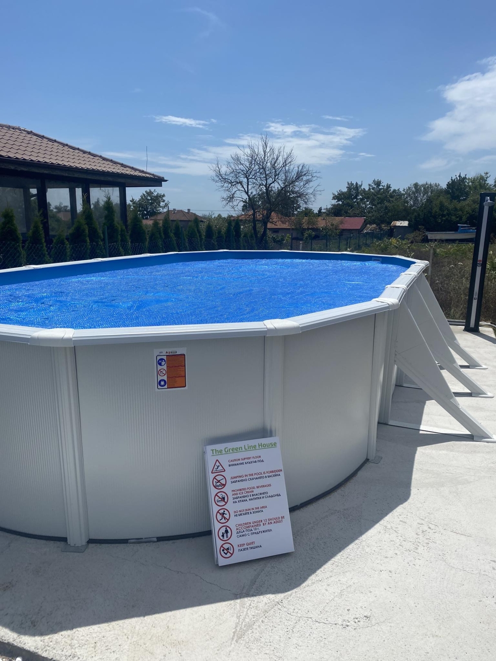 Дворът е озеленен, има зона за релакс, барбекю, електрическа скара, дивани, шезлонги с шалтета, летен душ и батут, където да се забавляват децата, голям сезонен испански басейн с размери 730/375см. Паркирането е свободно в двора и пред къщата.