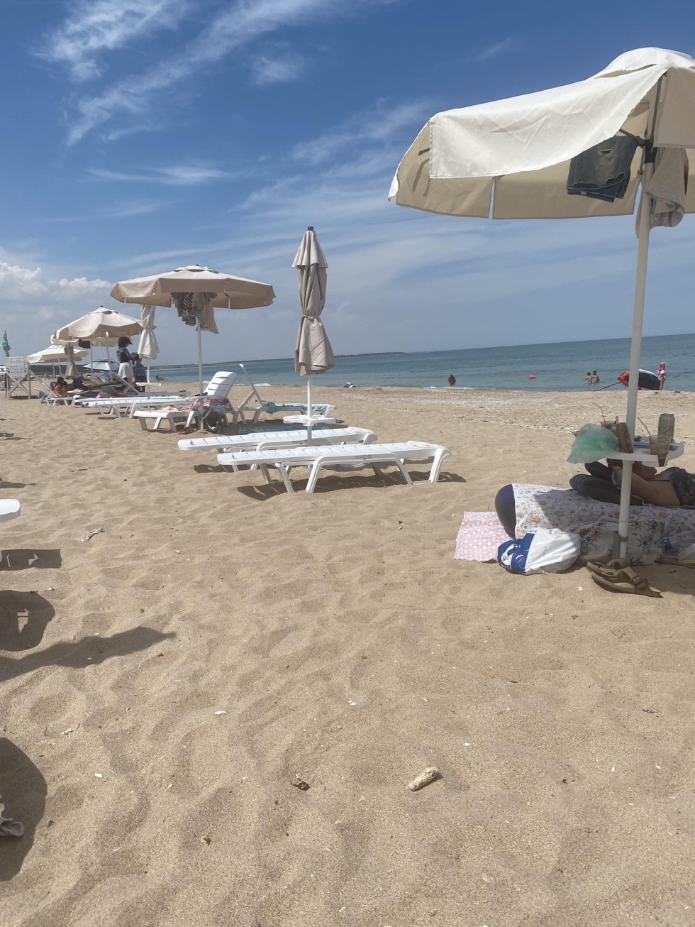 Прекрасен, огромен плаж на около 1, 200 км с безплатни места за паркиране в гора. Има и заведение с платени шезлонги и чадъри.