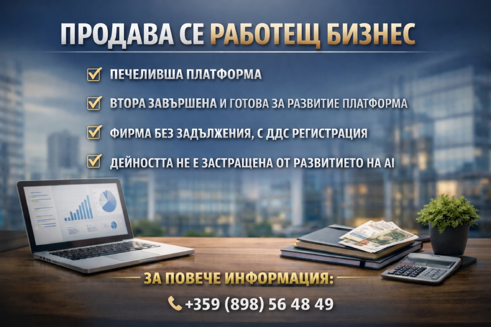 Продава се изграден и работещ бизнес в сферата на дигиталните платформи, с утвърдено пазарно присъствие, реална дейност и работещ модел, доказал своята практическа стойност. Сегментът, в който работи бизнесът, не е от тези, които ще бъдат изместени или обезценени от навлизането на изкуствения интелект. Дейността е свързана с реална пазарна необходимост, установени бизнес отношения и практическа стойност за клиентите. Това дава по-голяма устойчивост на модела и добра перспектива за развитие и в следващите години. Продажбата е конфиденциална, поради което в публичната обява не се посочват име, домейн и конкретни разпознаваеми детайли. Това се прави с цел да се запазят текущите бизнес отношения и нормалната работа с клиенти и партньори. При интерес, моля свържете се по имейл или се обадете на посочения телефон.