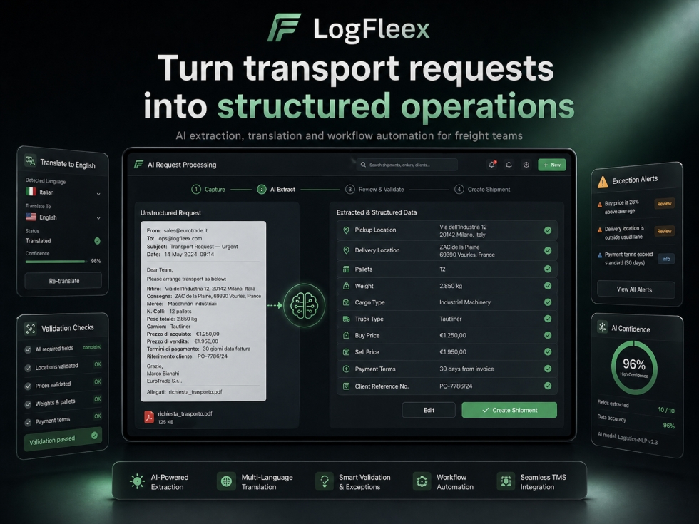 Чрез този подход LogFleex може да подпомага екипа при автоматично извличане на адреси, дати, часове, палети, тегло, товарни референции, цени, условия на плащане, данни за превозвачи и клиенти. Системата е насочена и към подготовка на автоматизирани отговори, откриване на липсваща информация, превод на международна комуникация и свързване на имейли с конкретни транспортни процеси.